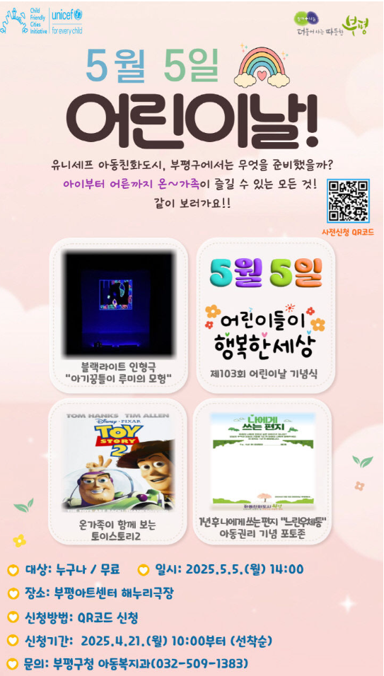 인천시 부평구는 오는 5월 5일 부평아트센터 해누리극장에서 제103회 어린이날을 맞아 아이들과 가족이 함께 즐길 수 있는 기념식 및 행사를 개최한다고 밝혔다. 이번 행사는 어린이들..