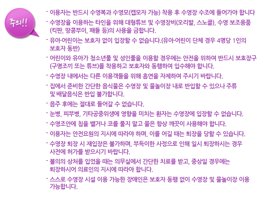 수영모 (캡모자 가능) 착용 후 수영장에 들어갈 수 있음